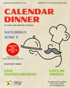 Come One – Come All!– to a delicious buffet roast beef dinner with all the trimmings, and with a fun twist! It is a “Calendar” dinner with the tables decorated in a theme of each month of the year! You may be seated at the October table and enjoy a Halloween theme or possibly join in the fun at the Canada Day table. We will have wonderful live entertainment, door prizes and lots of Silent Auction prizes to be won! This is our annual charity fundraisers with all proceeds being donated to a number of charities.